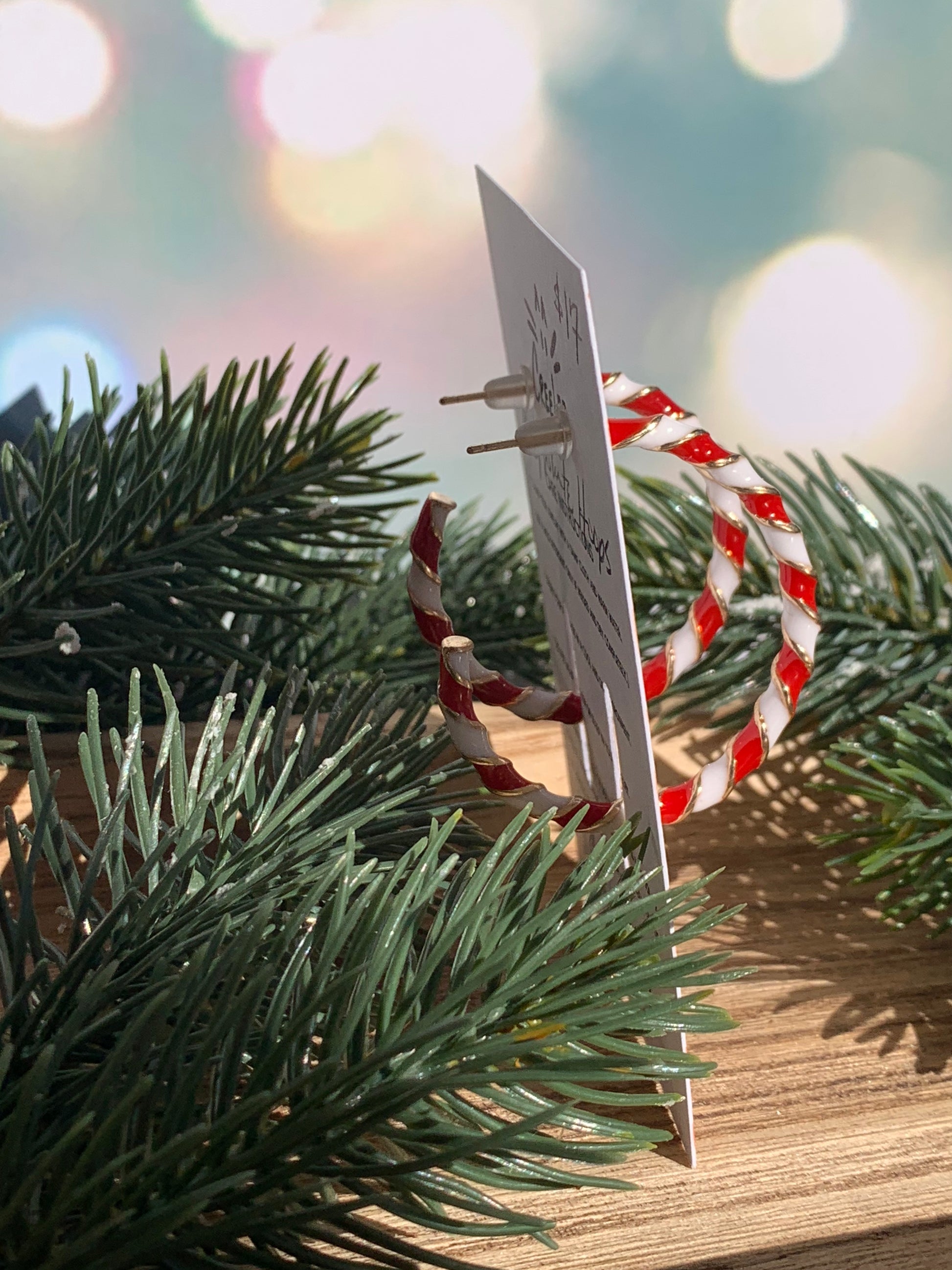 Channel classic holiday kitsch with candy-stripe open hoops in gold and enamel. The diagonal red & white stripes nod to vintage candy canes for a playful, nostalgic touch; straight-post fit and rubber backs keep them comfy for long wear.