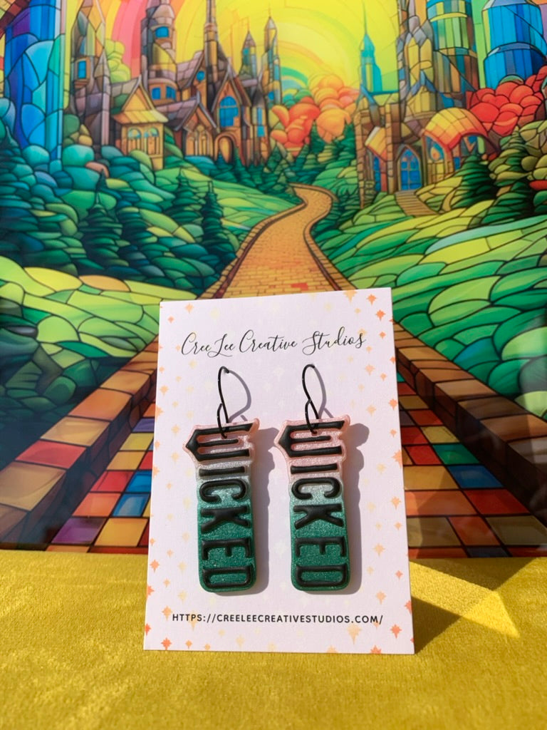 Pink, emerald and black polymer clay dangles spelling WICKED in bold movie font, with black stainless steel hooks. Lightweight, glamorous, unapologetic — channel your inner Elphaba and defy gravity with a statement piece worthy of the Emerald City spotlight. Your next statement piece is here.