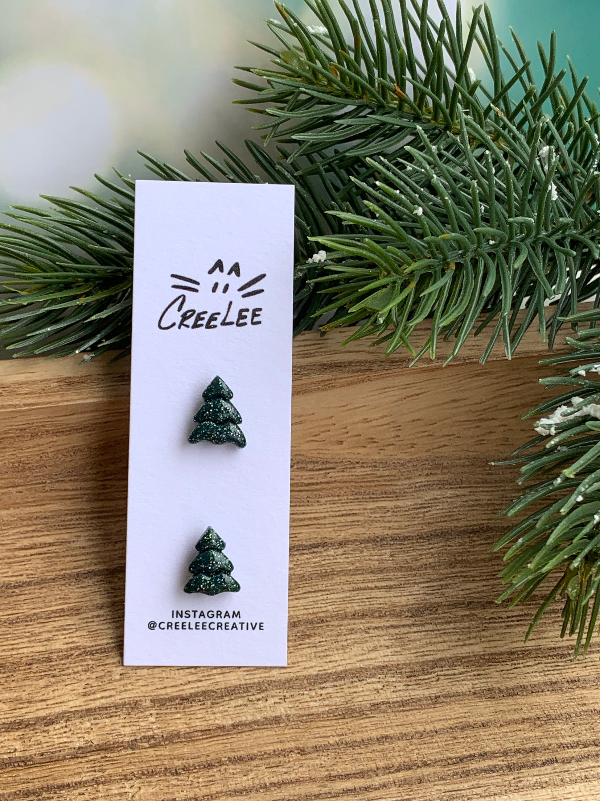 Shop handcrafted holiday tree stud earrings in multiple silhouettes and finishes. These small-scale studs are designed to be lightweight, comfortable, and visually impactful — perfect for shoppers searching for tree stud earrings, holiday studs, polymer clay studs, and stocking stuffer ideas. Each pair is made in small batches, finished with secure posts, and presented on a CreeLee Creative Studios card for easy gifting.