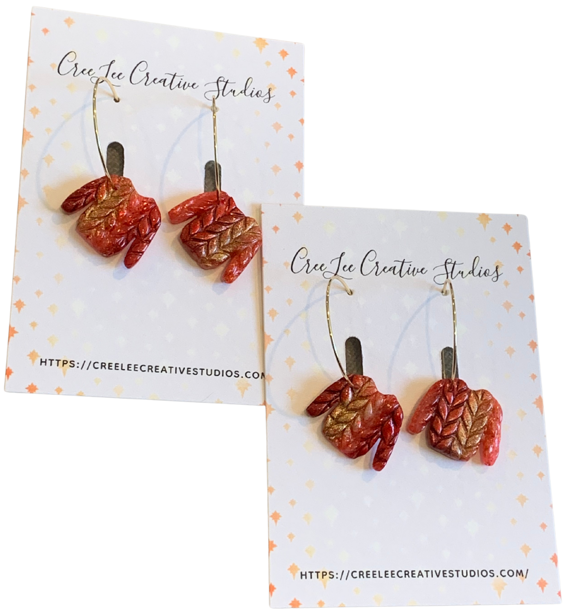 Add a pop of cozy charm to your look with these playful Winter - Red & Gold Sweater Hoop Earrings. Featuring maroon red sweaters crafted from polymer clay with delicate gold accents, each charm dangles from a 14k gold plated stainless steel hoop. These earrings bring festive warmth and unique style to any outfit, perfect for holiday fun or chilly day flair.