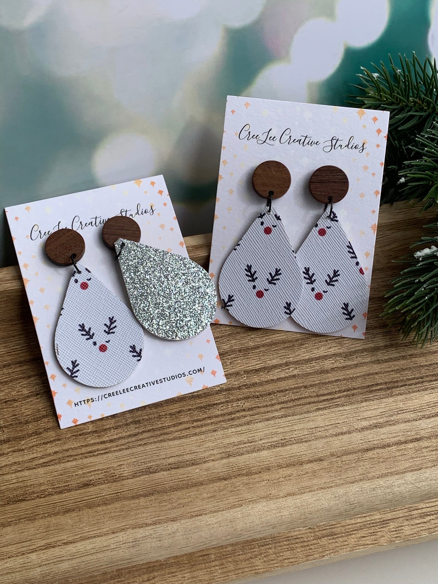 These Red Nose Reindeer Dangle Earrings combine festive charm with playful style. Crafted from white faux leather, each teardrop-shaped earring showcases a cute stylized red-nosed reindeer drawing, perfect for holiday fun. The wooden findings add a natural touch, while the sparkling silver back brings a lively shimmer. Lightweight and comfortable, these faux leather earrings make a whimsical accessory to brighten any winter outfit. Ideal for reindeer lovers and holiday celebrations, they’re a fun addition to your seasonal jewelry collection.